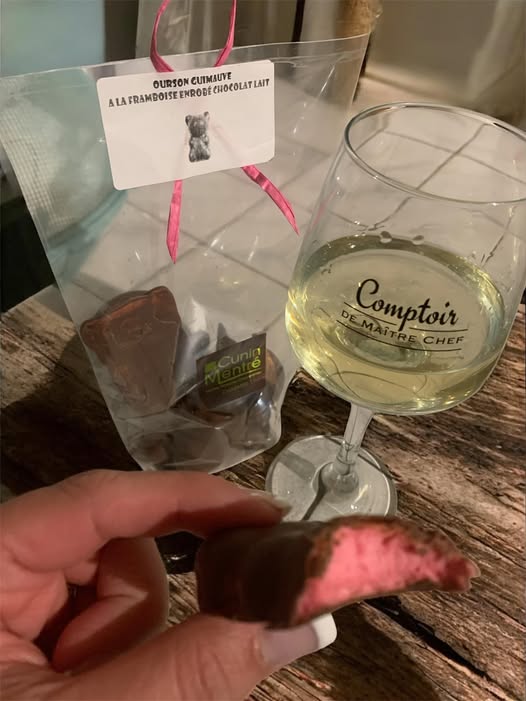 Les essayer… c est les adopter! Nos oursons guimauve framboise dans une robe chocolat au lait ou de chocolat noir… Disponibles aussi en guimauve vanille et guimauve à la violette À l instar de notre cliente, vous pouvez également les déguster accompagnes d’un verre de vin (à consommer avec modération, l alcool est dangereux pour la santé)