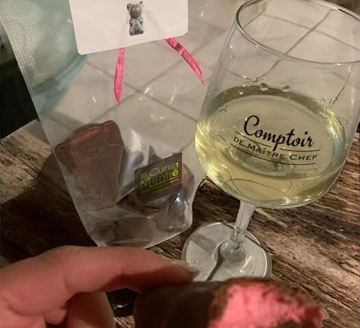 Les essayer… c est les adopter! Nos oursons guimauve framboise dans une robe chocolat au lait ou de chocolat noir… Disponibles aussi en guimauve vanille et guimauve à la violette À l instar de notre cliente, vous pouvez également les déguster accompagnes d’un verre de vin (à consommer avec modération, l alcool est dangereux pour la santé)